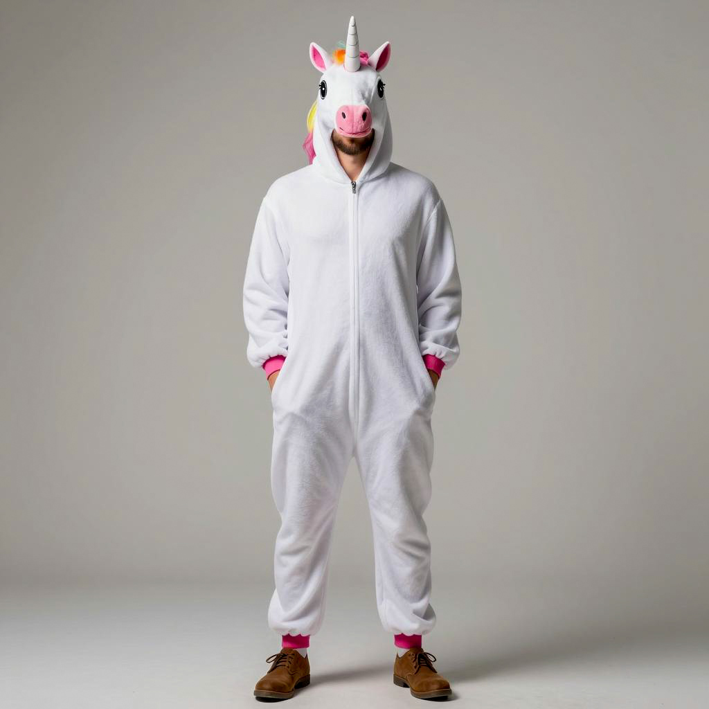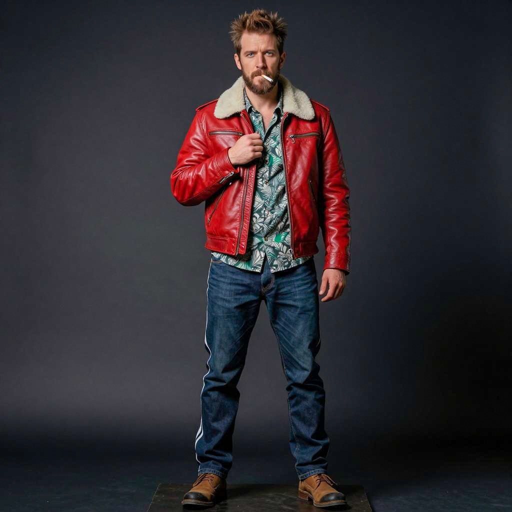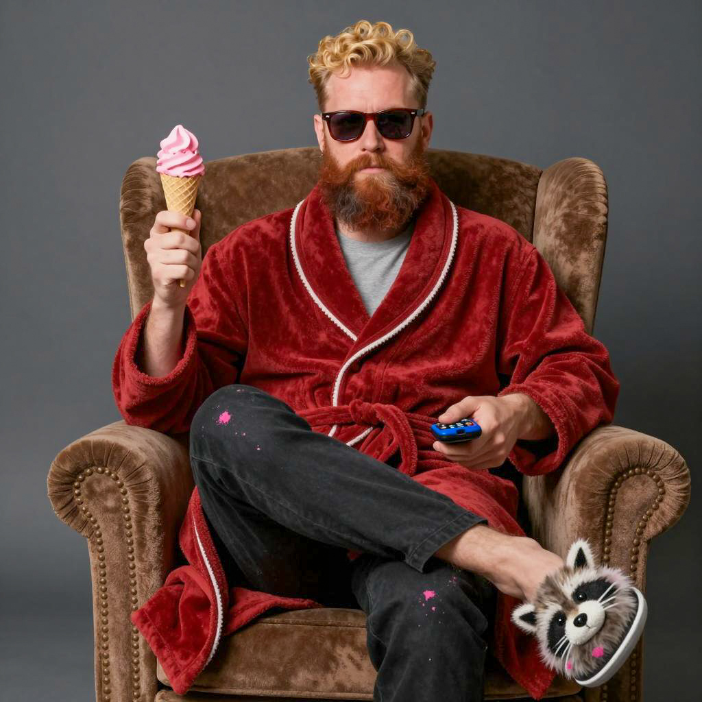 Bearded man with curly brown hair, wearing sunglasses, grey t-shirt, and bloody red bathrobe, sits in brown armchair. He holds a pink ice cream cone in his right hand and a blue object in his left hand. Wears raccoon slippers with pink ice cream drips. Dark grey background. Blood stains on bathrobe and pants. Casual, slightly disheveled appearance. Intense, relaxed expression. Photo.