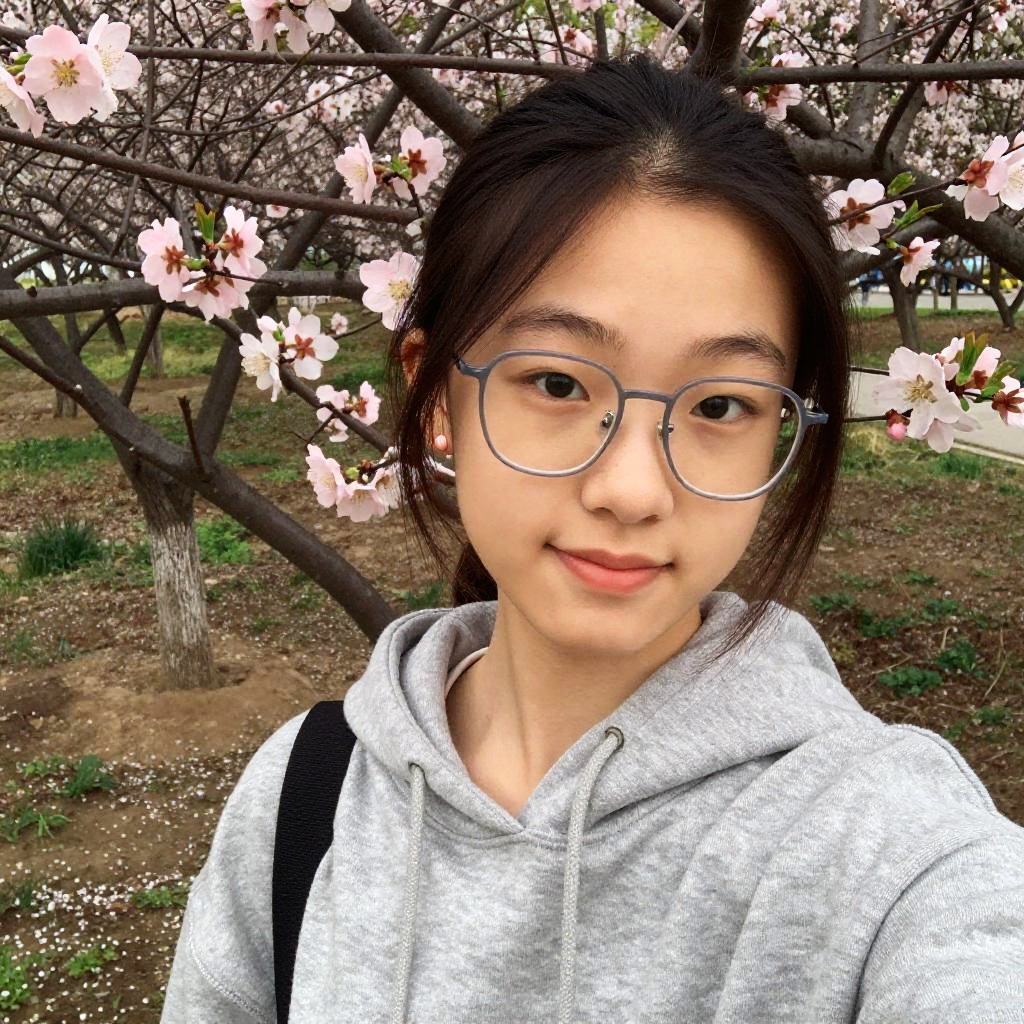 13 year old girl selfie in a park, surrounded by blooming flowers, casual hoodie and glasses, soft natural light, gentle smile, fresh and vibrant vibe with nature elements
