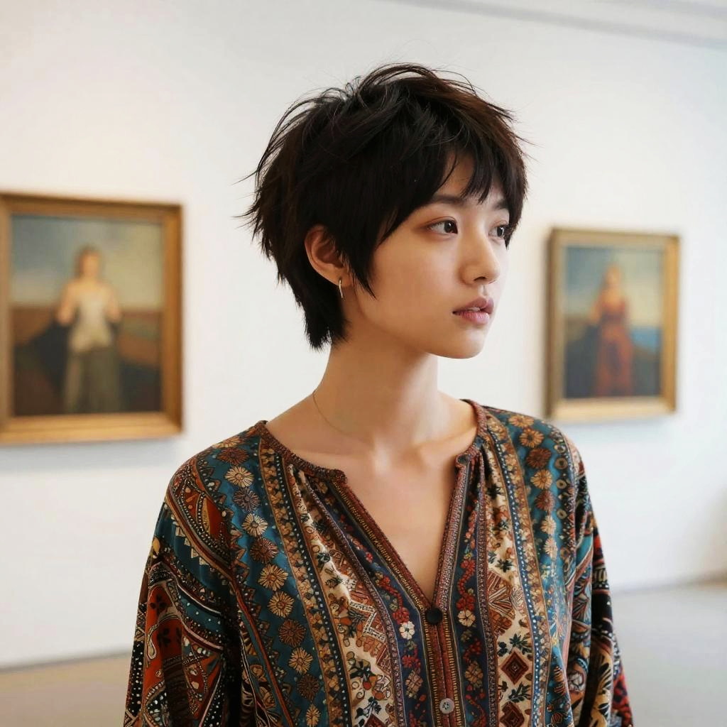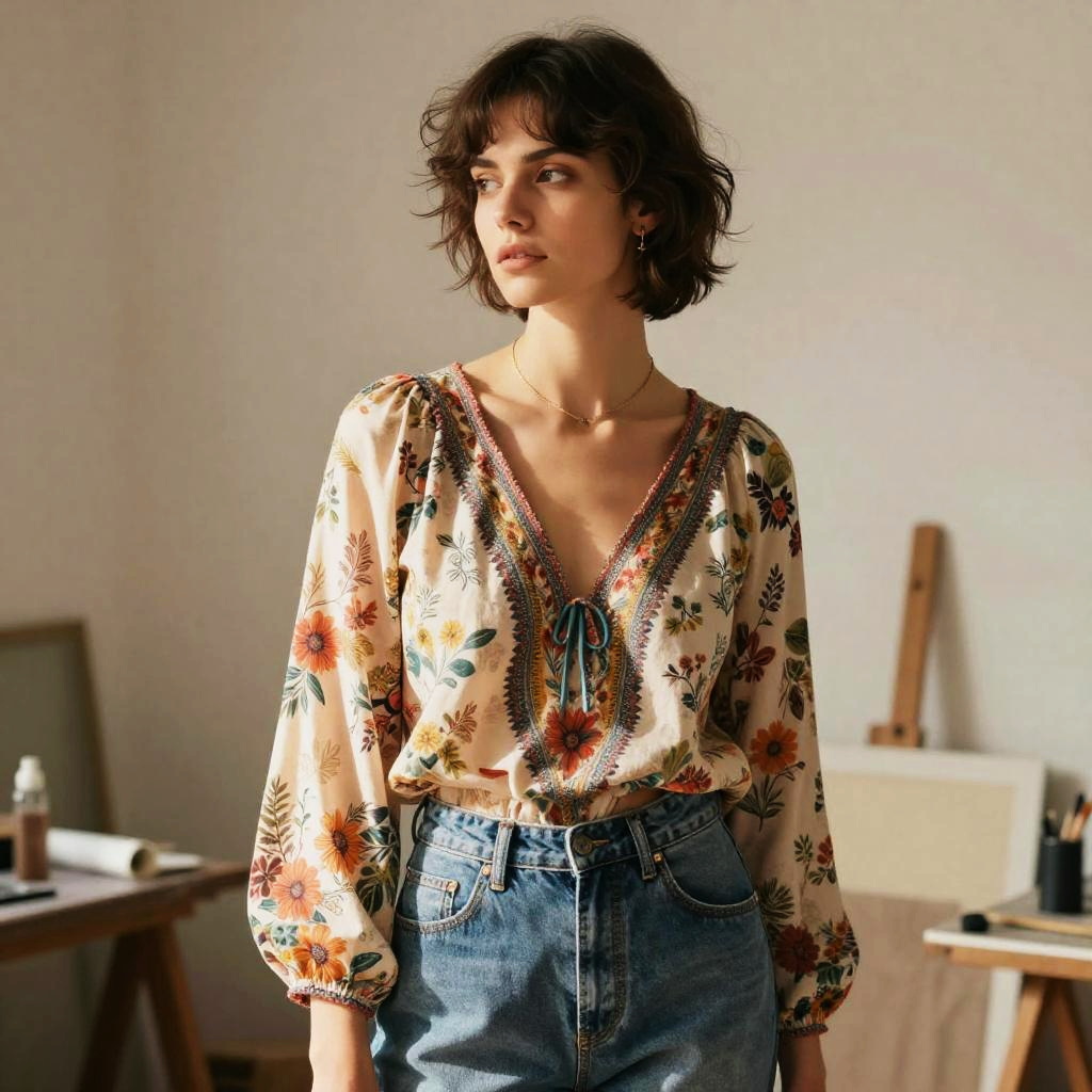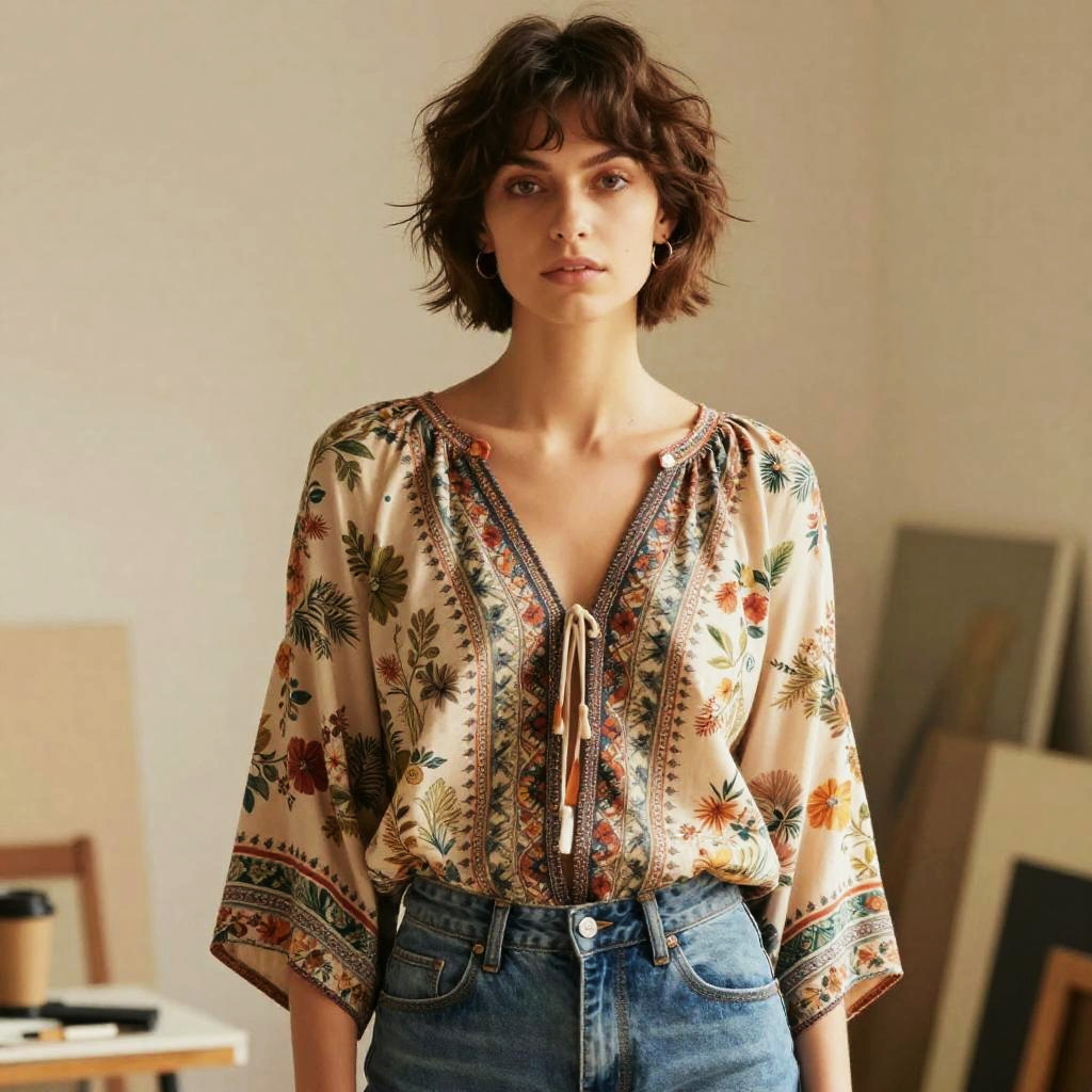 Short Shag hairstyle on fashion model, wearing bohemian floral blouse and jeans, in artist studio, captured in fashion editorial style with warm natural light.