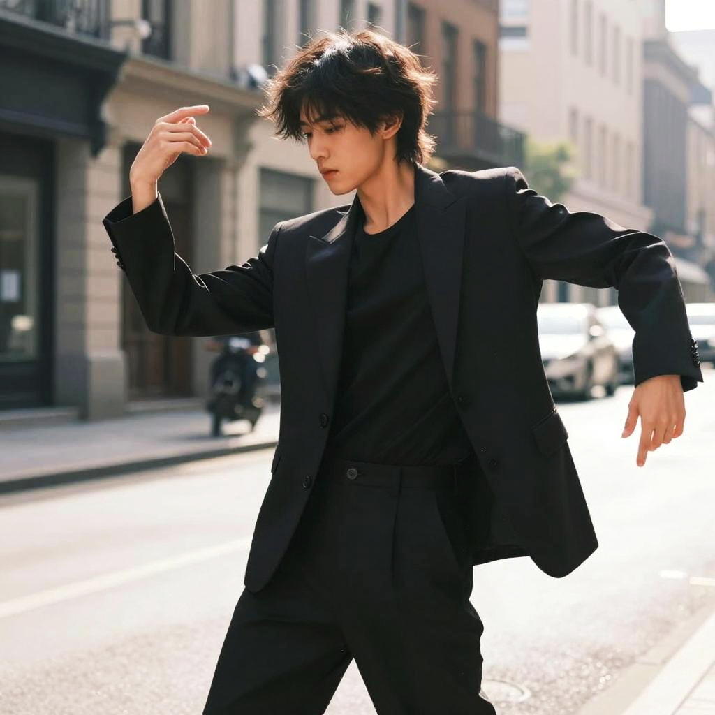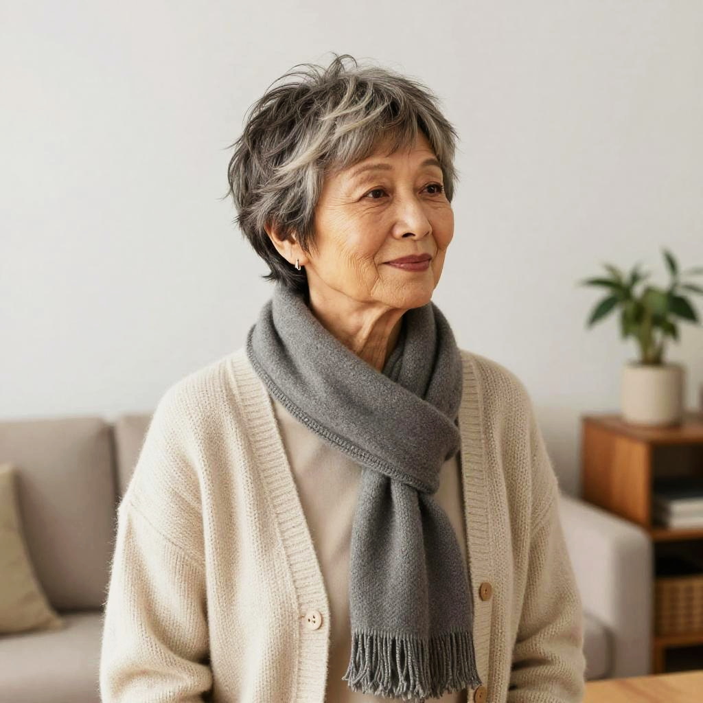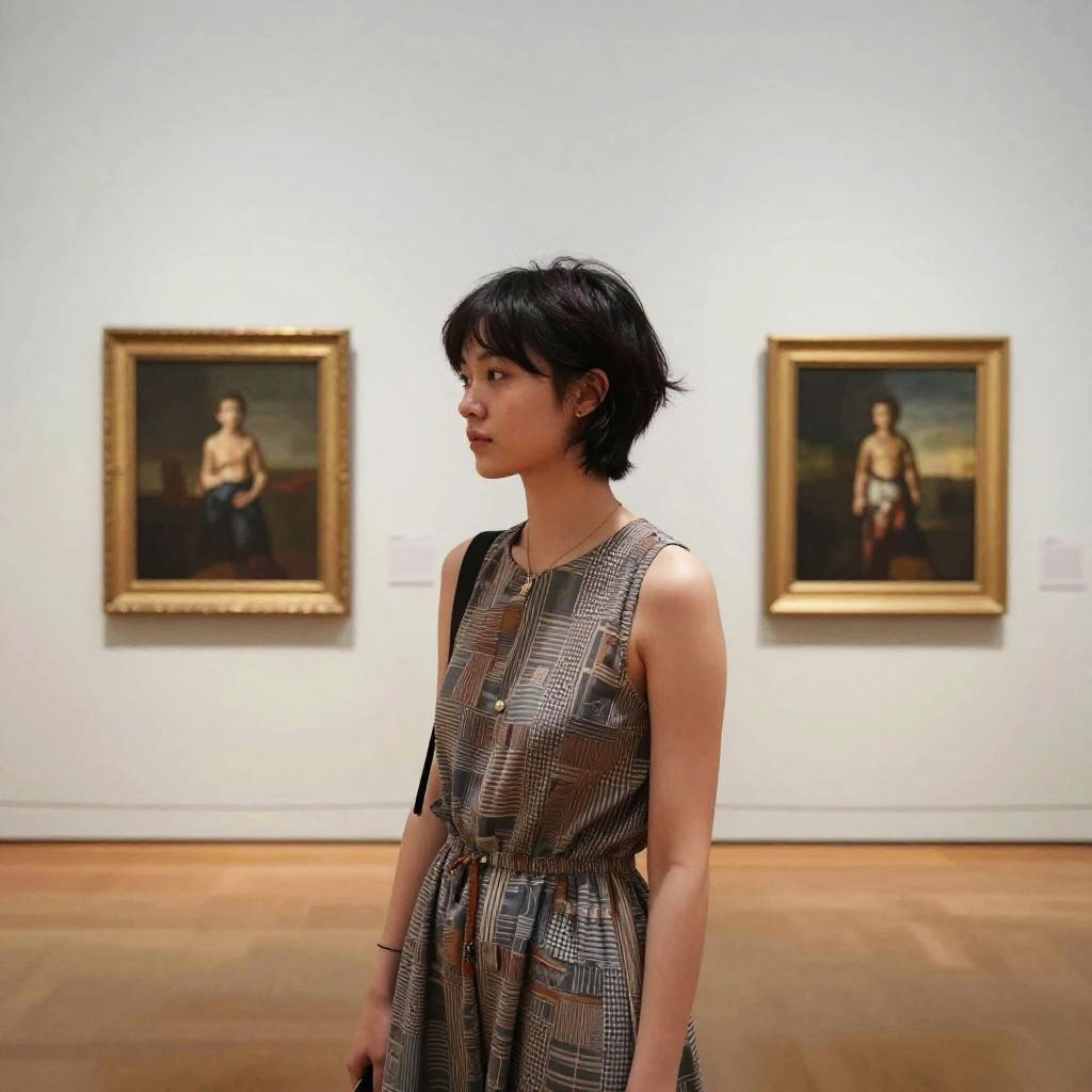 Short Shag hairstyle on fashion model, wearing bohemian floral blouse and jeans, in artist studio, captured in fashion editorial style with warm natural light.