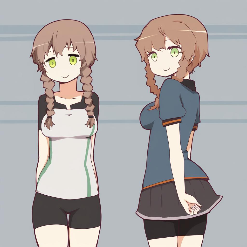 Amane suzuha, steins;gate, 1girl, yellow eyes, green eyes, brown hair, long hair, twin braids, medium breasts, bike shorts, by artist i.u.y, leet