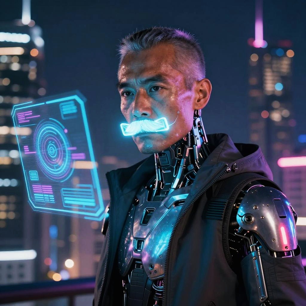 Futuristic Cyborg with Neon Mustache