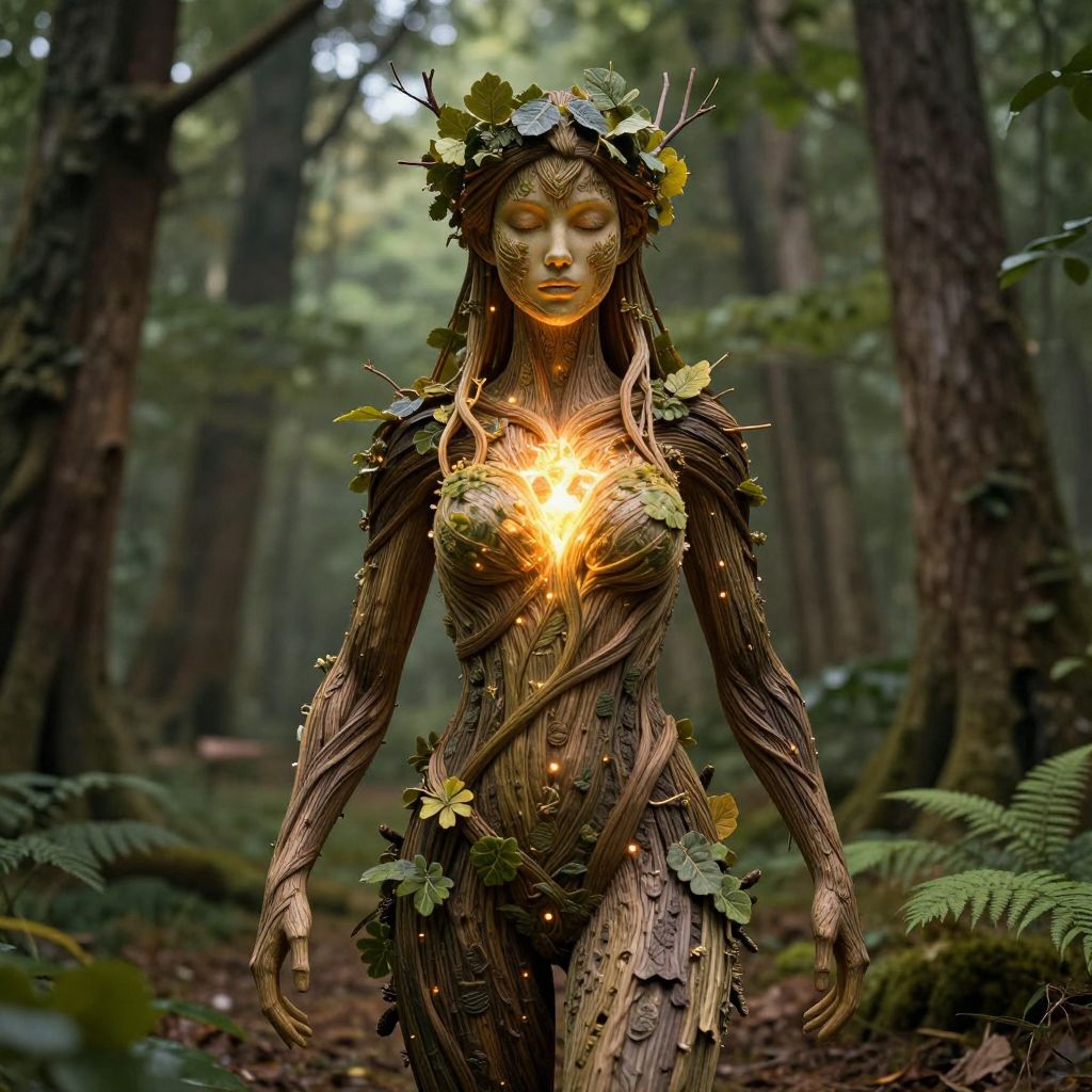 Digital artwork of a forest nymph with golden glowing chest, wooden textured body, leafy crown, and ethereal forest background.