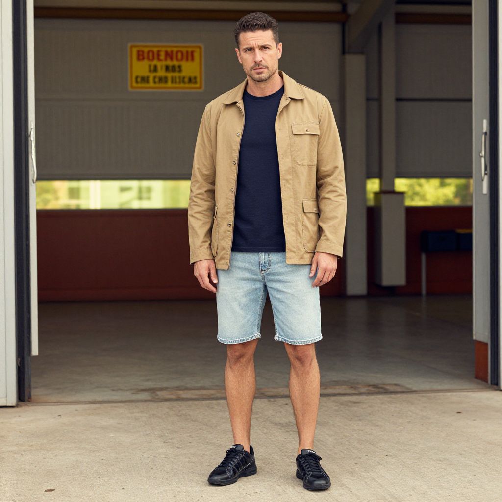 Photograph of a muscular man in a navy tracksuit with shorts, black sneakers, standing confidently in a modern, lit room.