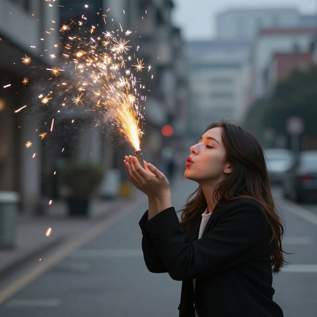 A woman gently blows out a cascade of shimmering golden sparks, defying gravity as they float upward in a mesmerizing, otherworldly display against a blurred urban backdrop.