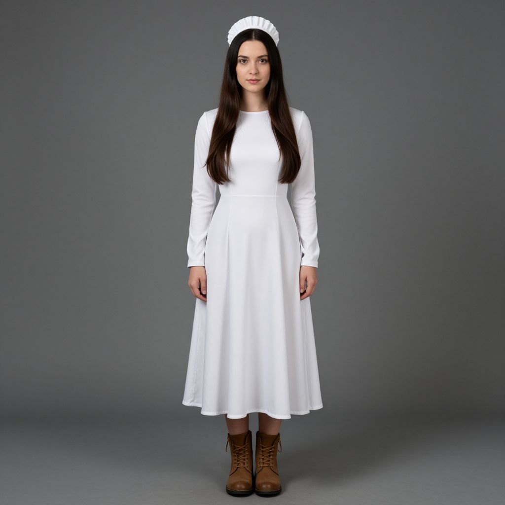 Tin lady woman costume, 1girl, solo, dress, long hair, standing, white dress, looking at viewer, white headwear, full body, long sleeves, brown hair, brown footwear, realistic, boots, black hair