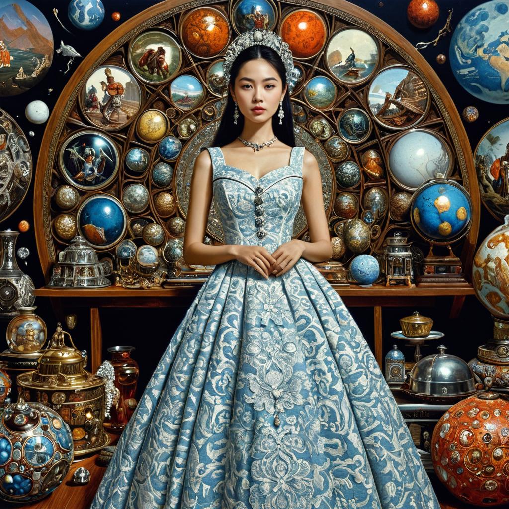 Extra perfectness women, amateur, sweetest face, mid shot, fashion model type, expansive dress with treasure's, gorgeous, extremely high details quality, bao phan, viktor safonkin, bruce pennington, larry elmore, norman rockwell, intricate, hyperrealistic matte painting, deep depth field, hd, hdr, 4 k, 8 k