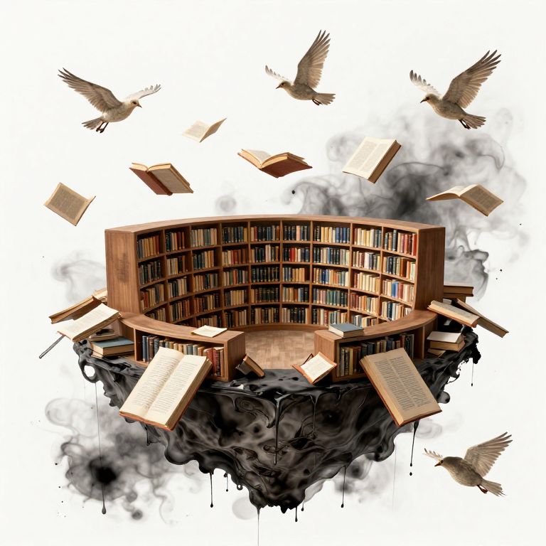 Digital artwork depicting a floating, semi-circular wooden bookshelf filled with books, emerging from a dark, cloud-like base. Surrounding the bookshelf are several flying birds with outstretched wings. Open books with visible text are suspended in mid-air around the bookshelf. The background is mostly white, with black, smoky tendrils emanating from the base, adding a sense of mystery and weightlessness. The overall style is surreal and fantastical, with a focus on the contrast between the wooden bookshelf and the dark, ethereal background.