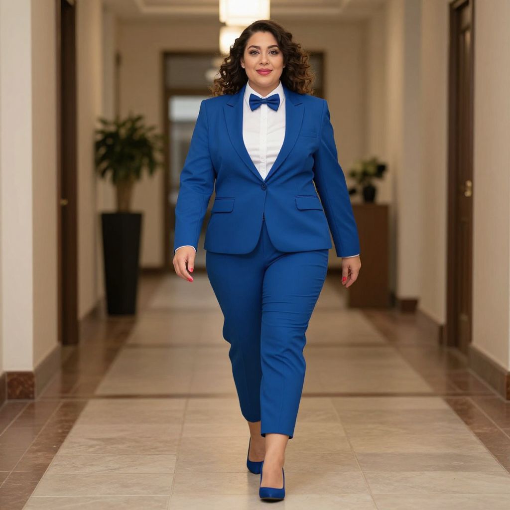 Photograph of a confident woman with curly dark hair, wearing a blue suit, white shirt, blue bow tie, and matching blue heels, walking down