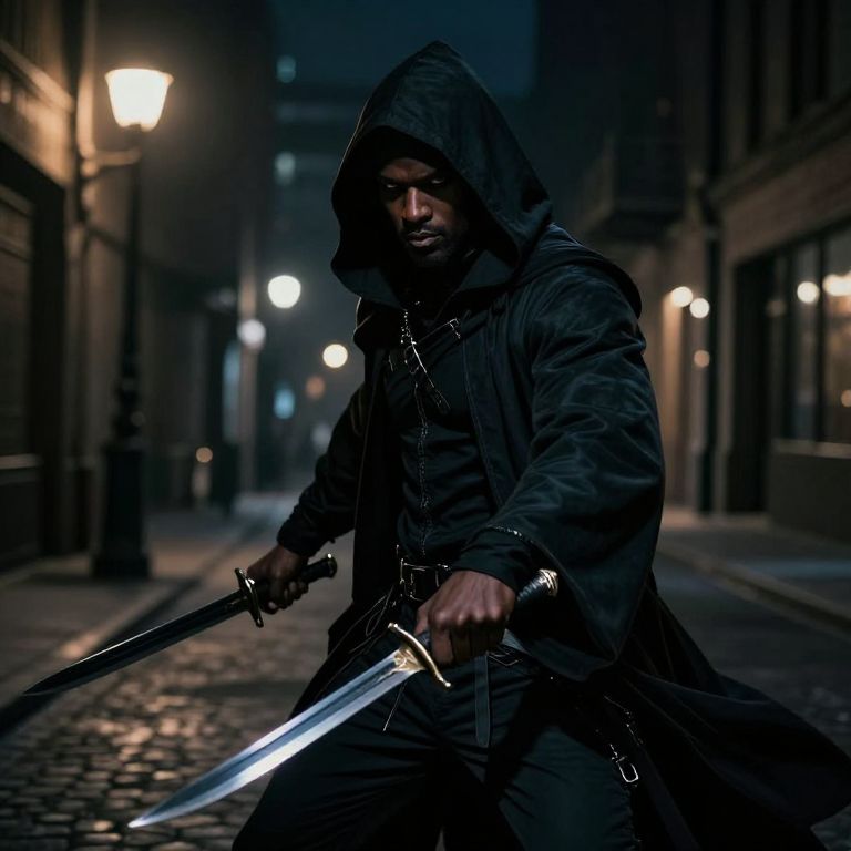 Black half elf rogue slipping through shadowy city streets at night, hooded cloak blending with darkness, dual daggers glinting under street lamps, confident and stealthy expression, urban fantasy vibe, rich textures and moody atmosphere
