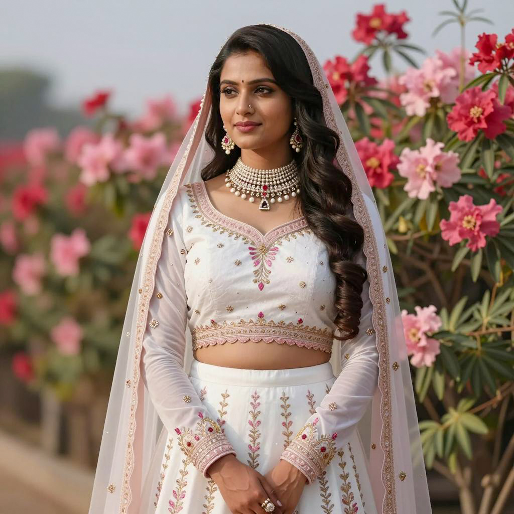 Purple lehenga bride, photograph of Indian woman standing in colorful garden, wearing traditional pink and purple lehenga with intricate patterns, sheer dupatta, gold jewelry, bindi, long dark hair in loose waves, hands clasped in front, bright sunlight, background with pink roses and yellow flowers, blurred greenery and trees, realistic style, daytime, Indian attire, elegant, detailed embroidery, soft focus, natural light
