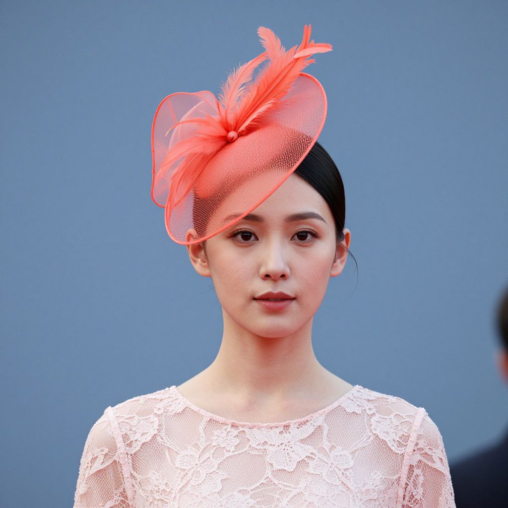 Photograph of an Asian woman with fair skin and black hair, wearing a white lace top and a vibrant red fascinator hat adorned with feathers. She has a neutral expression and is centered against a solid blue background. The hat's sheer red fabric contrasts with her lace top, adding a pop of color. Her makeup is minimal, emphasizing her natural beauty. The image is sharply focused on her face and hat, with the background blurred.