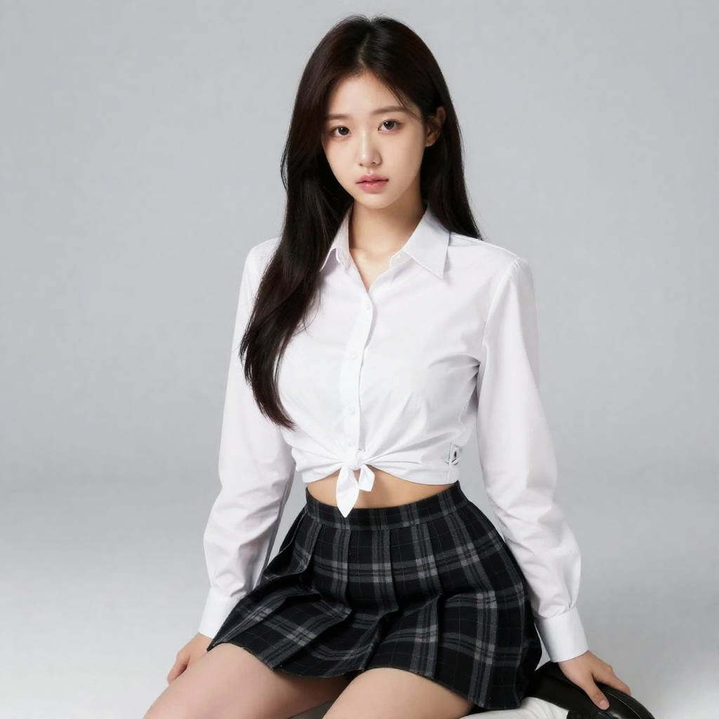 Korean beauty, korean mixed, realistic, (((best quality))), 8k, ((masterpiece)), (an extremely delicate and beautiful), extremely detailed, ((extremely detailed face)), ((extremely detailed eyes)), absurdres, best quality, 1girl, solo, (knotted shirt), (shirt pull), (no bra:1.3), black short plaid skirt, long sleeves, (tight clothing:1.3), shiny skin, shiny hair, (long hair:1.3), (medium breasted:1.4), ((((all fours in school)))), (full body:1.3)