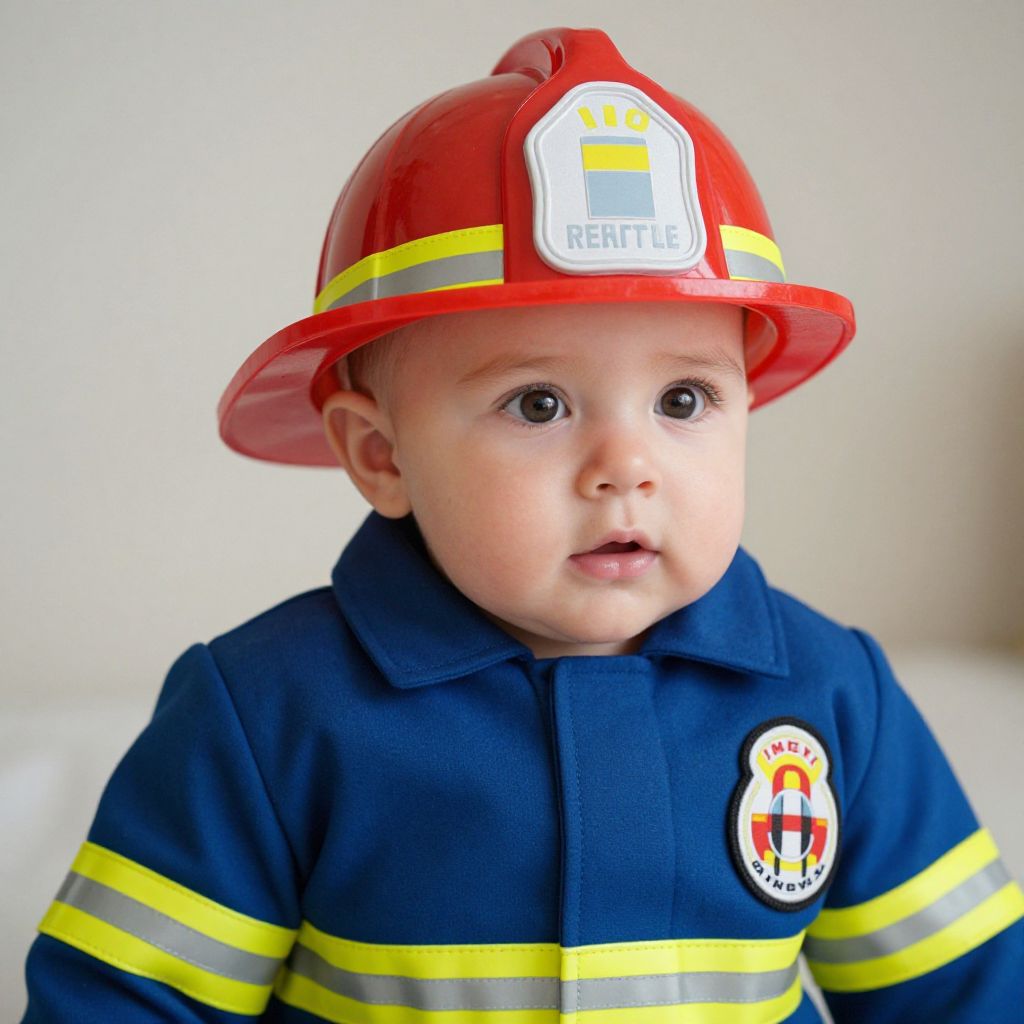 Infant Fireman Costume Age, a close up of a baby wearing a fireman's uniform