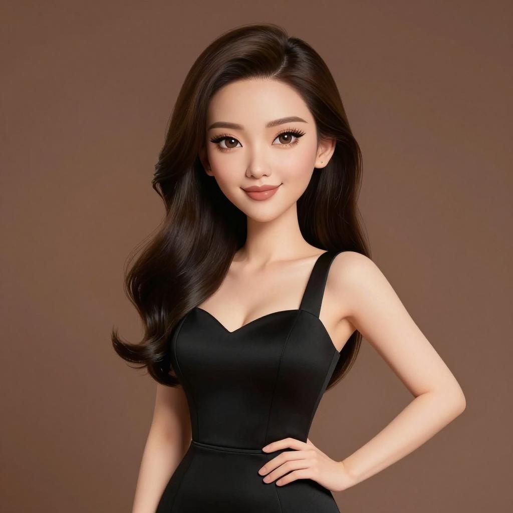 A stylized cartoon caricature of a confident woman with long dark hair wearing a sleek black dress, smooth shading and glossy finish, realistic skin texture, vibrant colors, set against a warm brown gradient background, cinematic lighting, sharp details