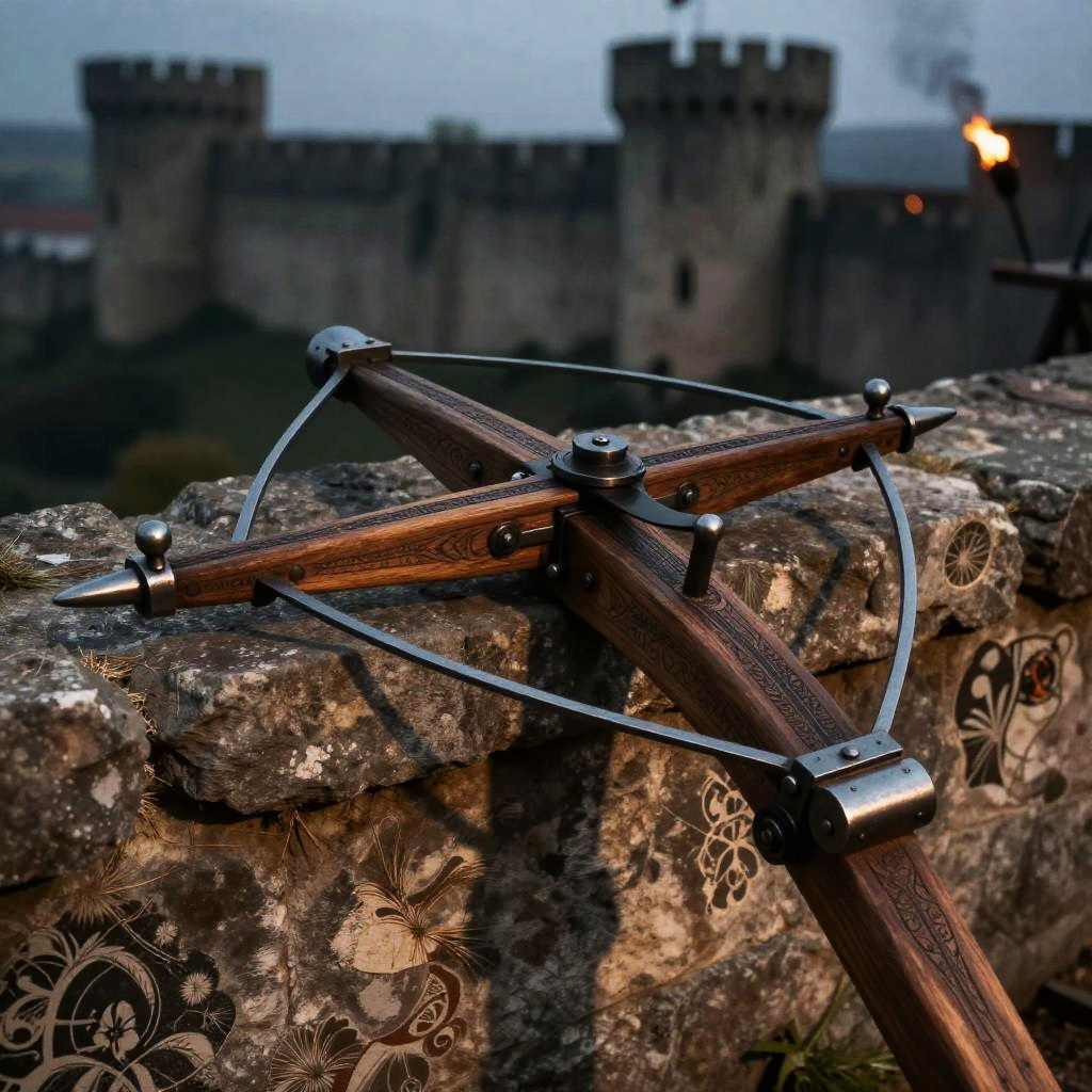 Medieval hand crossbow resting on ancient stone wall, detailed wooden and metal construction, dim torchlight illuminating intricate engravings, atmospheric castle background