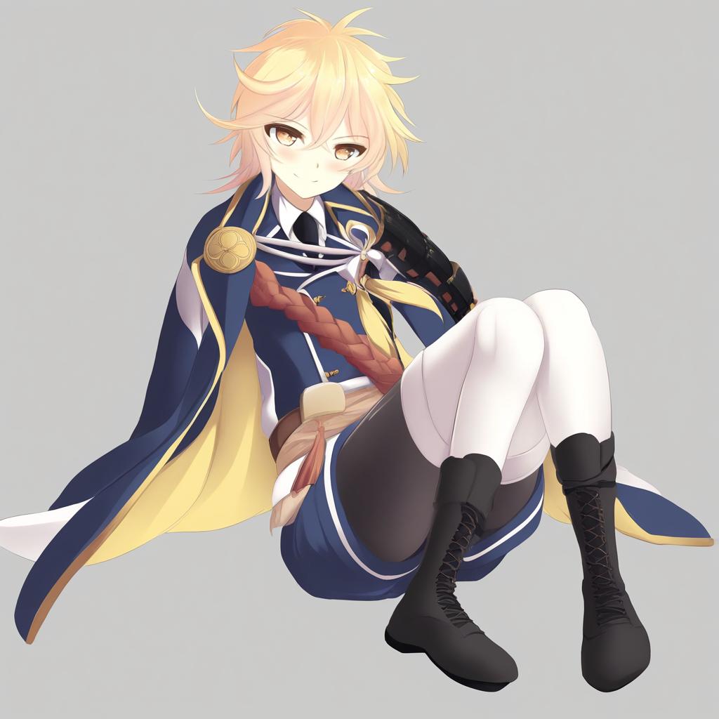Monoyoshi sadamune, touken ranbu, 1boy, yellow eyes, blonde hair, pantyhose under shorts, lace-up boots, by artist sukage, leet