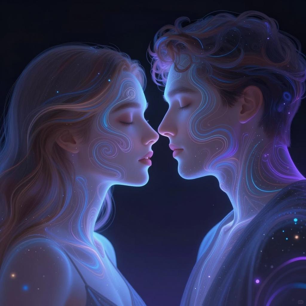 Digital illustration of a close-up, face-to-face interaction between a man and a woman. Both have ethereal, neon-colored, swirling patterns covering their faces and upper bodies. Dark background contrasts with glowing blue and purple hues. Woman has wavy, light brown hair, man has short, curly hair. Foreheads nearly touch, eyes closed, lips slightly parted. Illuminated outlines highlight their profiles. Cosmic, bioluminescent ures envelop their forms.