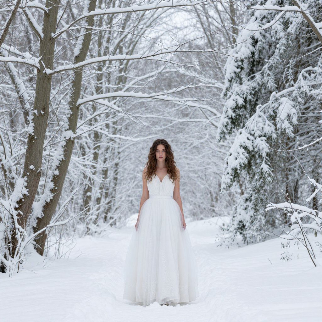 "Snow White Dressing, woman in white dress standing in snow covered forest"