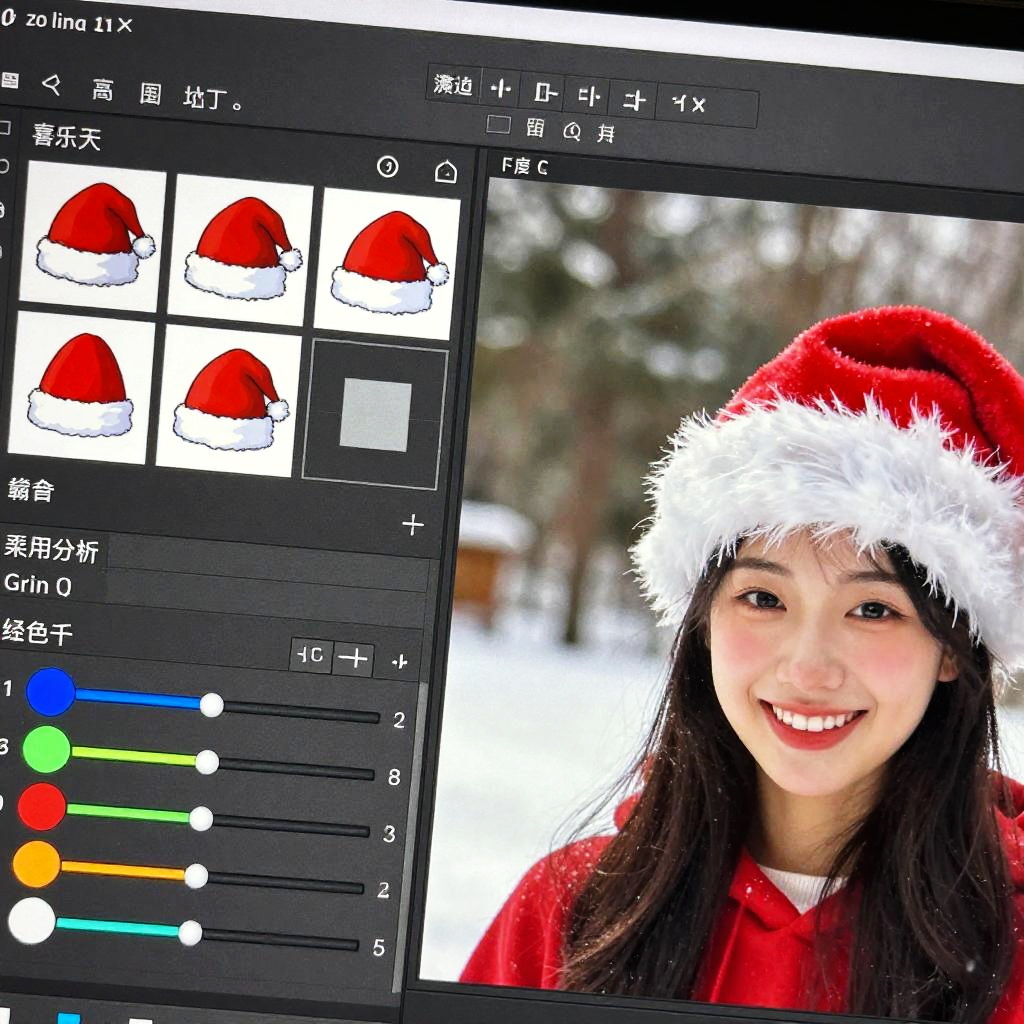 Close-up of a digital Santa hat editor interface highlighting a toolbar with selection of Santa hat designs, color customization sliders, and preview window showing a smiling person wearing a fluffy Santa hat, set against a snowy outdoor scene.