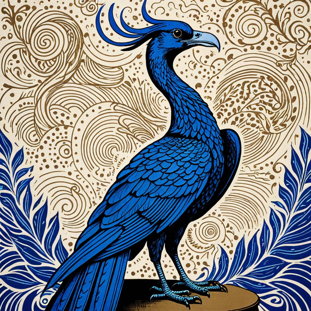 A doodle showing an art print with a phoenix on it, in the style of art nouveau fantasy, with a color palette of sepia and forest green. Inspired by Coles Phillips and figura serpentinata.