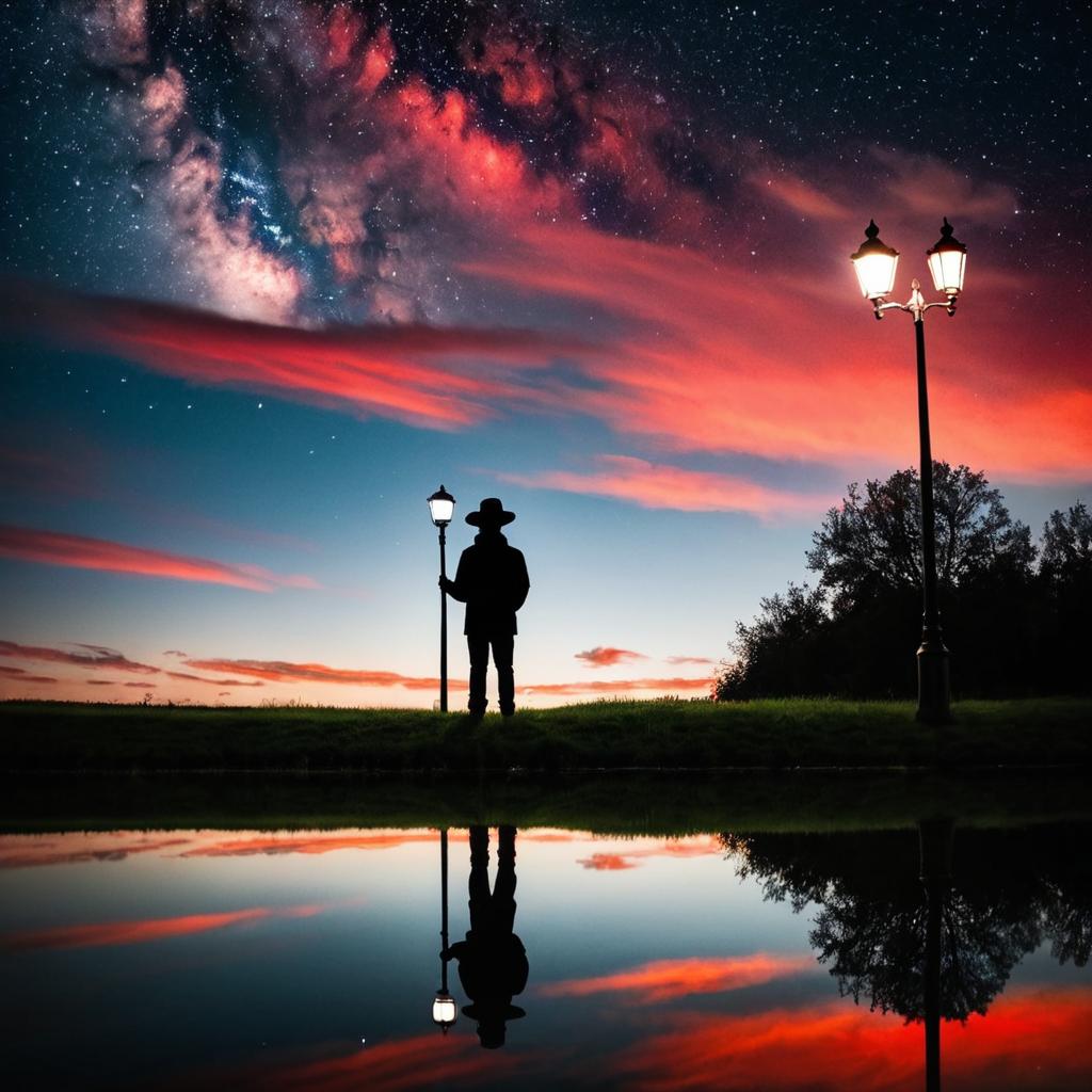 Silhouette of a boy wearing a red hat and dark jacket standing on grass beside a calm reflective water surface during sunset. Two lit lampposts flank the boy, casting a warm glow. The sky features dramatic red and blue tones, with dense clouds and a vivid starry night filled with stars and the Milky Way. The scene conveys serene contemplation with vibrant colors and stunning natural beauty.