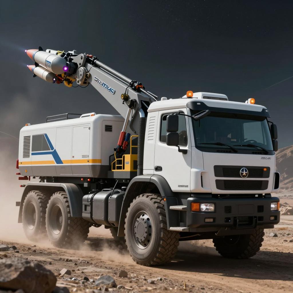 Hyper-realistic image of a futuristic white construction truck equipped with rocket propulsion and laser attachments. The vehicle features six rugged off-road tires, a crane arm with mounted rockets, and advanced mechanical components, designed for mining expensive minerals on extraterrestrial terrain. The setting appears to be a rocky planetary surface under a dark, starry sky, conveying a high-tech, sci-fi mining operation.