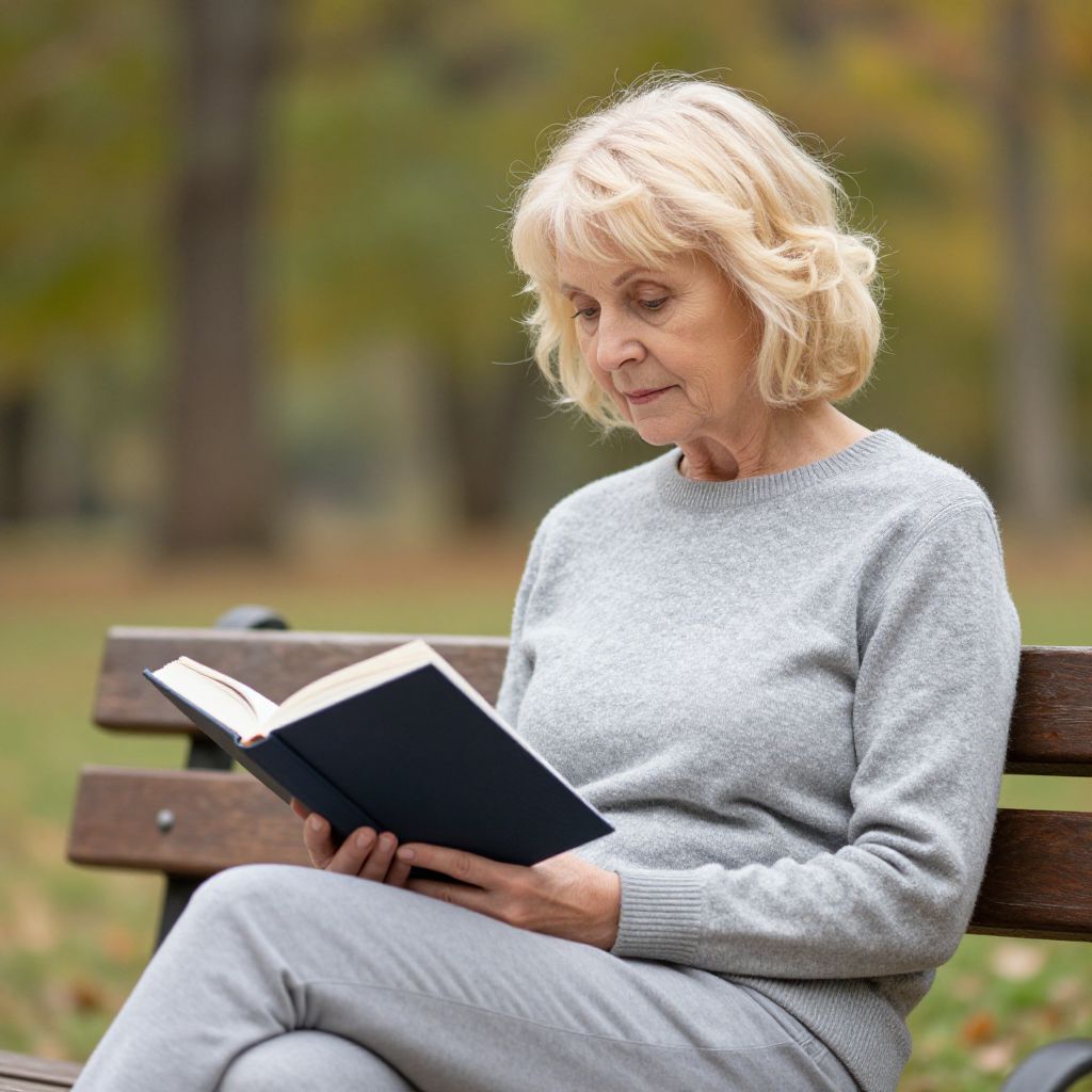 Photograph of a blonde elderly woman in a gray sweater and pants, sitting on a wooden bench in a park, reading a book with a focused expression