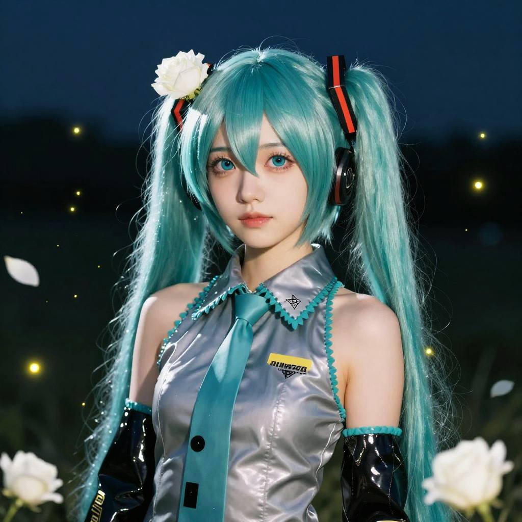 Face focus, masterpiece, best quality, 1girl, hatsune miku, goth hatsune miku, latex clothing, suggestive face, hentai face, white roses, petals, night background, fireflies, light particle, solo, aqua hair with twin tails, aqua eyes, standing, pixiv, depth of field, cinematic composition, best lighting, looking up