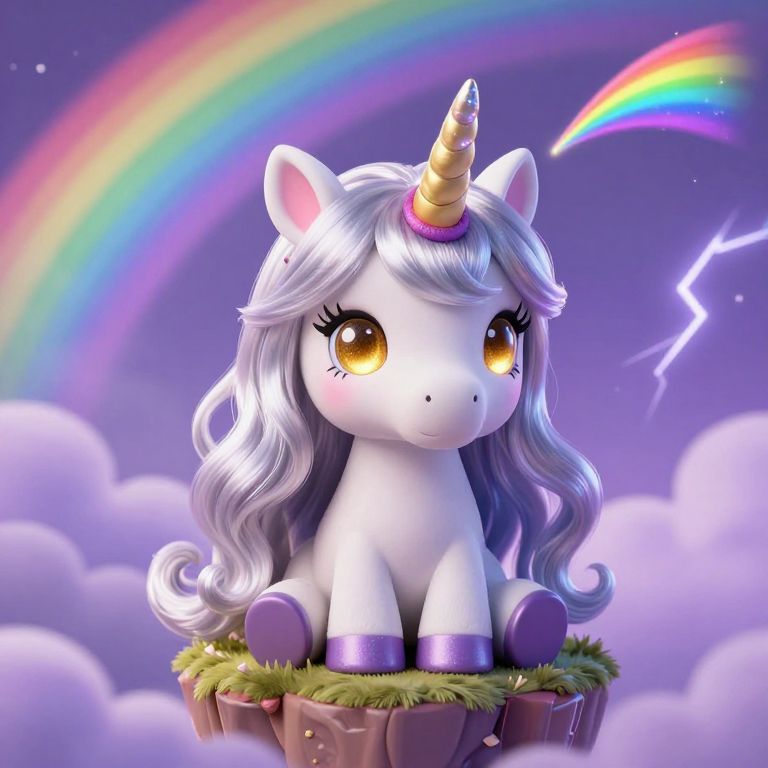 A high-detail close-up of a cute unicorn girl with long, wavy silver hair and glowing golden eyes, sitting on a floating island above a stormy rainbow sky, her rainbow horn shimmering with rainbow-colored glitter that trails like a comet, with soft lavender clouds and lightning patterns in the background.