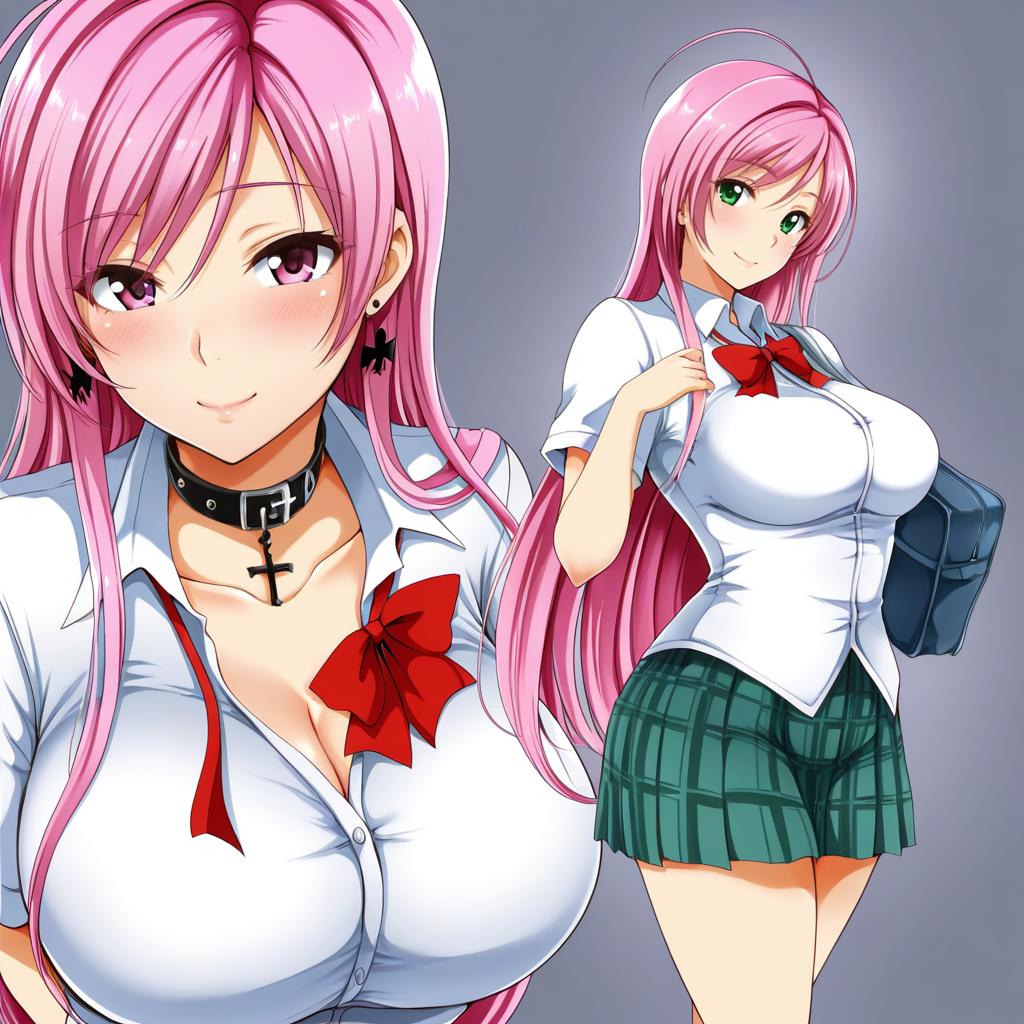 Akashiya moka, rosario+vampire, 1girl, red eyes, green eyes, pink hair, very long hair, long hair, large breasts, school uniform, collar, by artist miyagoe yoshitsuki, leet