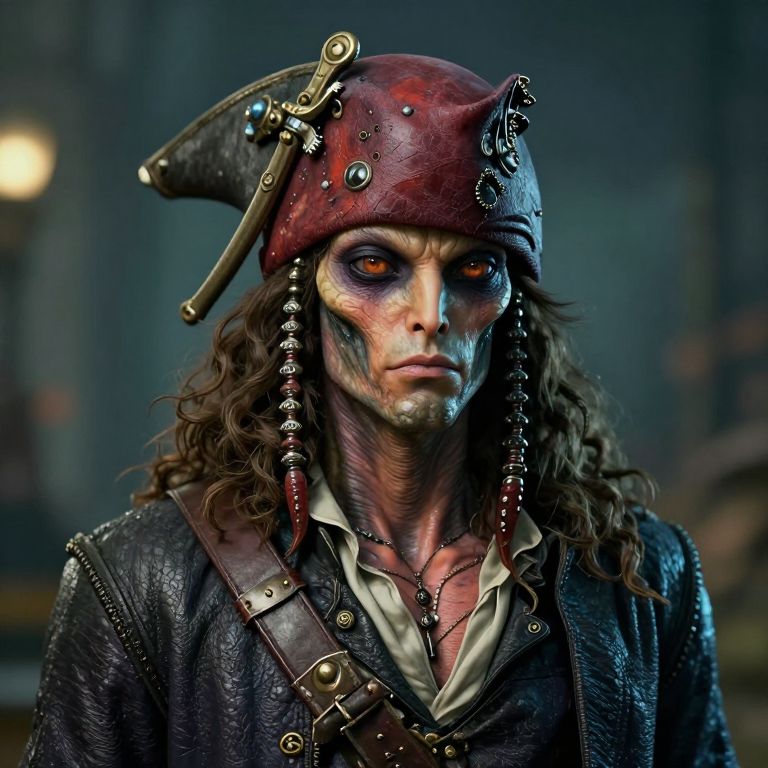 Incredibly realistic, too detailed portrait of victorian pirate extraterrestrial, octane render, bump mapping, macro image, global illumination, 8 k, bokeh, xenoblade, d & d, elder scrolls, one piece