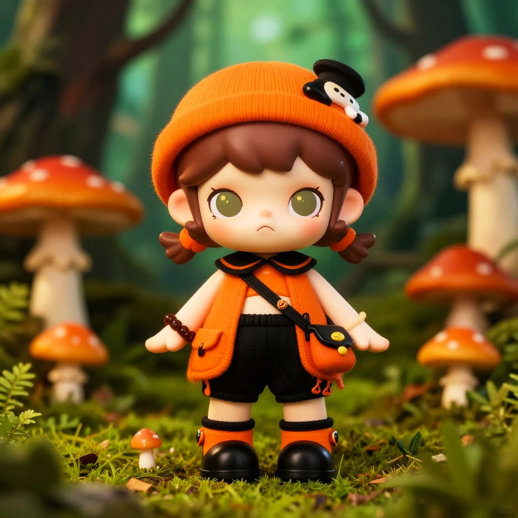 This striking illustration features a doll-like character adorned in a vibrant orange and black outfit, complete with intricate details and whimsical accessories. Surrounded by a fantastical forest setting with orange mushrooms and lush green foliage, the image captures a playful, enchanting atmosphere, evoking a sense of magic and wonder.