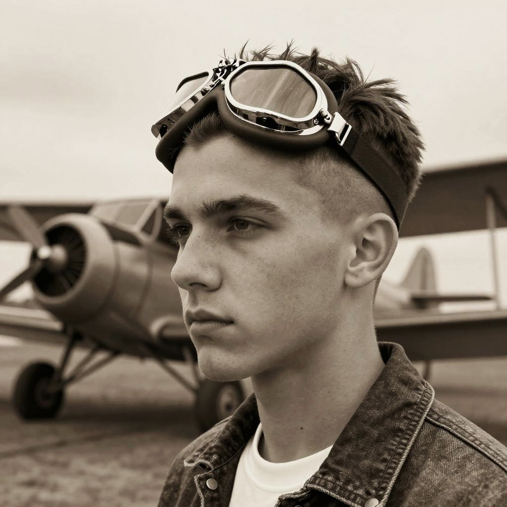 Photograph of a young man with a close-cropped, fade haircut, viewed in profile from the left. He wears black aviator goggles on his head and a black shirt with a white collar. The background shows a blurred, vintage wooden biplane with visible propeller and wheels, inside a dimly lit hangar with metal beams and a concrete floor. The image emphasizes the man's clean, modern hairstyle contrasted with the vintage aviation theme. The lighting is soft, highlighting the man's profile and the texture of the plane's wood.