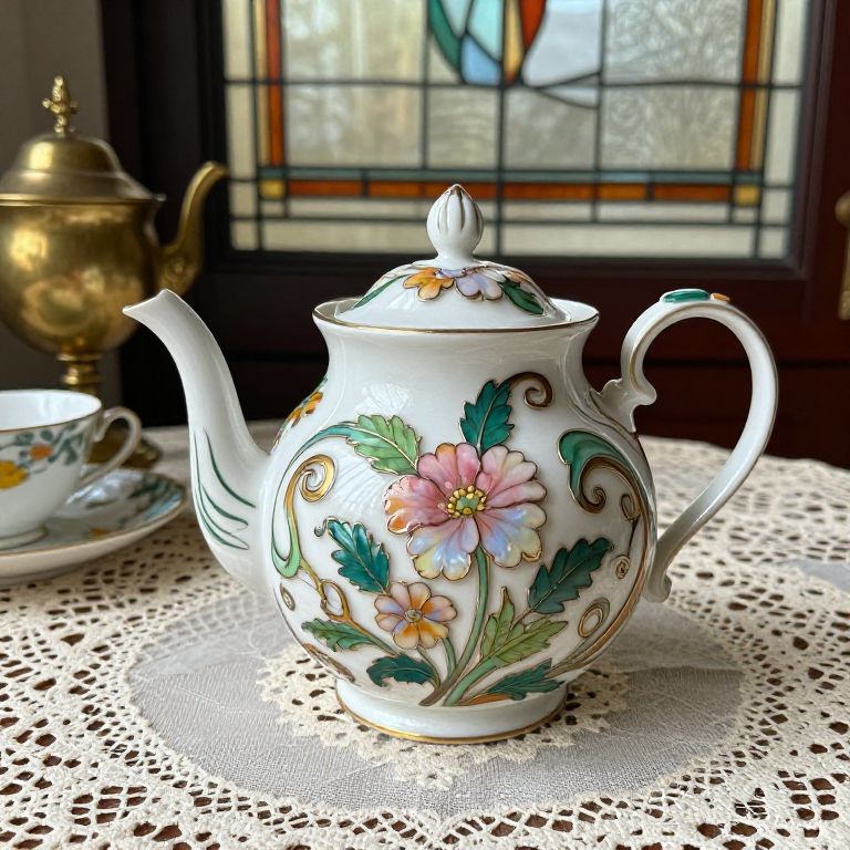 Art nouveau teapot featuring swirling organic lines, adorned with pastel-colored flowers and leaves in enamel, placed on a lace-covered table with a backdrop of an antique brass tea set and a stained glass window.