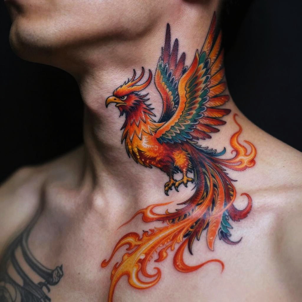 Anime neck tattoo showing a fierce phoenix rising, fiery colors and fluid motion lines, dramatic lighting with shadows, blending traditional and modern anime aesthetics