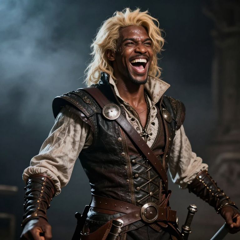"Sparkling light skinned black male swashbuckler rouge bard of valor laughing fighting shadows with blonde hair high definition 4k vivid colors on outfit smokey background laughing while fighting,"