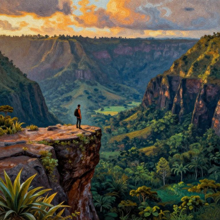 Seurat Pointillism An adventurer on the edge of a cliff, sublime mountainous archipelago, wild landscape, jungle and mountains, epic and mystic twilight, green, gold, brown, blue, dark orange,