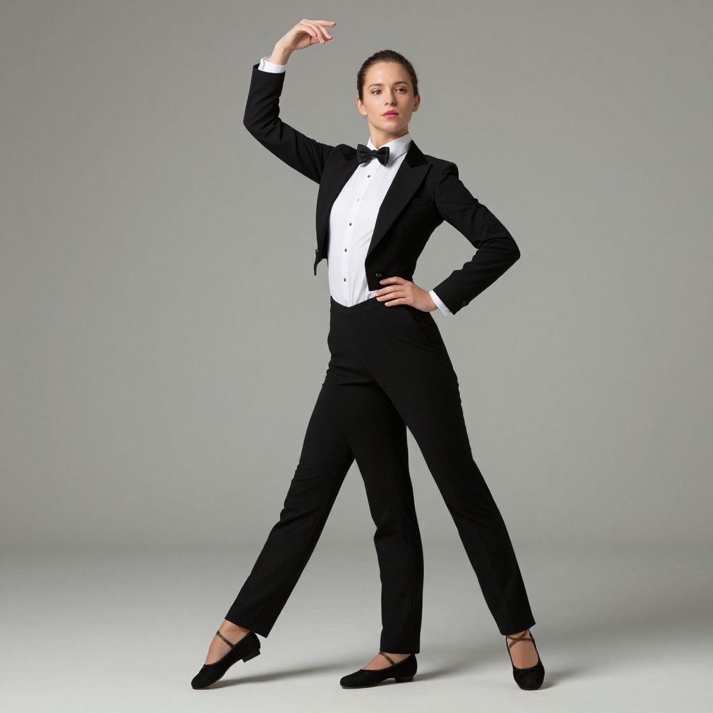 "Tuxedo Style Dance Costume, image of a woman in a tuxedo posing for a picture"