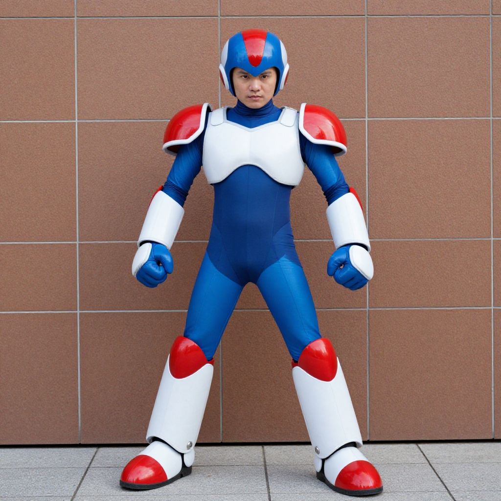 A man wearing a detailed and realistic Mega Man X costume, featuring blue armor with red and white accents, posing confidently against a brown tiled wall outdoors. The cosplay includes a helmet, gloves, and large armored boots, closely resembling the iconic video game character Mega Man X.