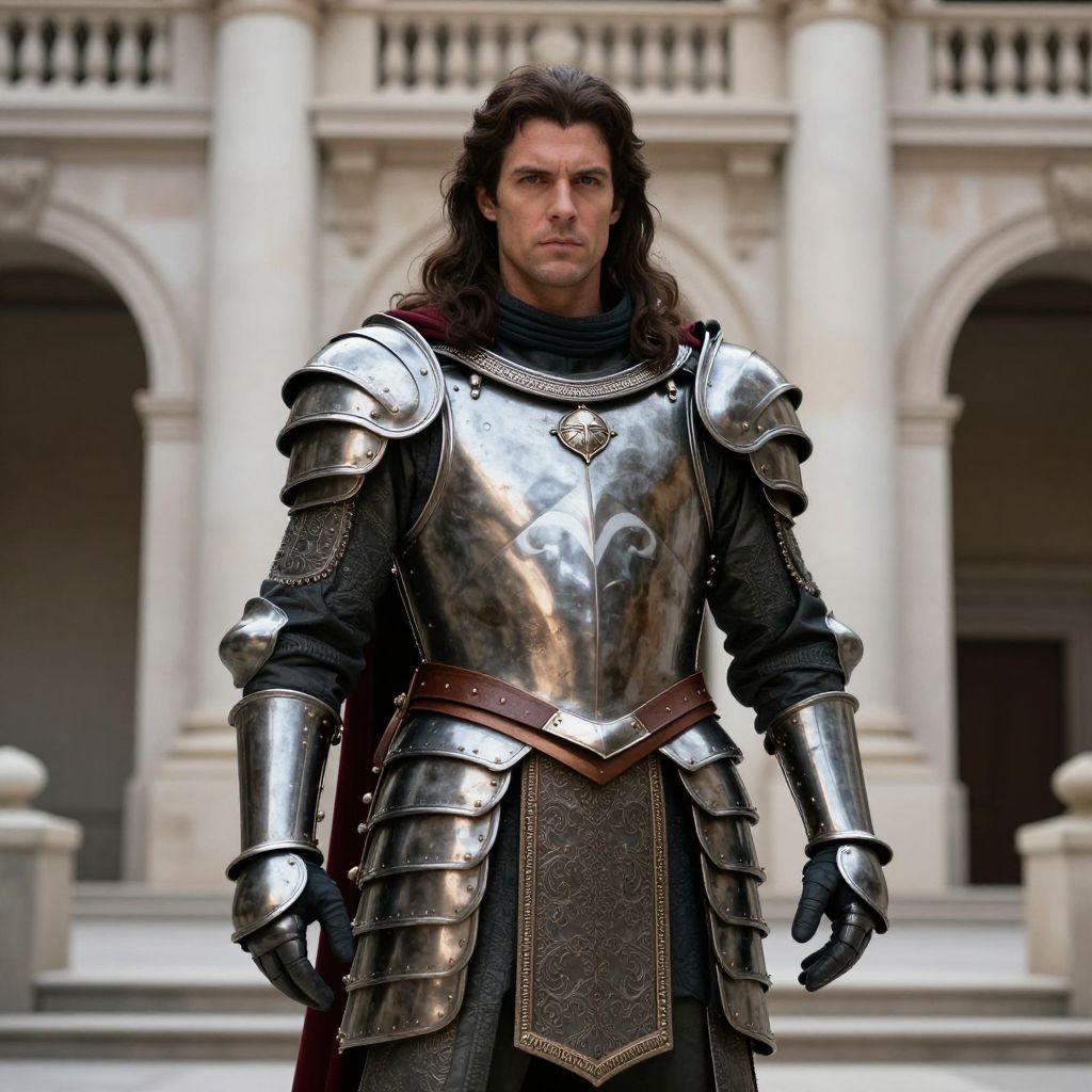 Photorealistic CGI image of a tall, muscular man with long, dark brown hair and a serious expression, standing in front of a classical architectural background with white columns and arches. He wears shiny, silver medieval armor with intricate patterns, black leather gloves, and a dark, patterned tunic with a red belt. The armor includes pauldrons, a breastplate with a central emblem, and gauntlets. The background features stone steps and a balustrade, adding a historical, regal feel to the image. The man's intense gaze and strong stance convey a sense of authority and readiness.