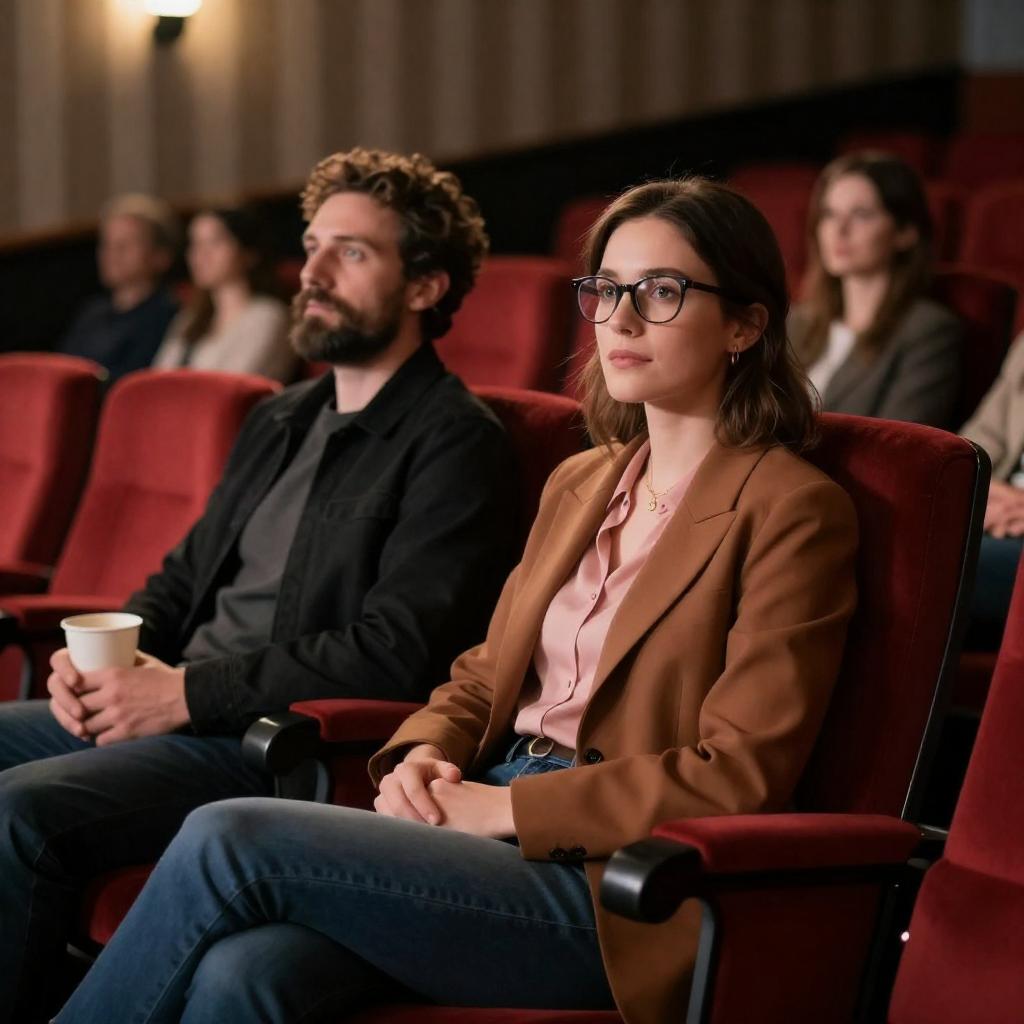 A young woman with glasses, wearing a brown jacket and pink blouse, sits attentively in a red armchair in a movie theater. Behind her, a bearded man in a black jacket holds a disposable coffee cup. The background shows other blurred audience members seated in red chairs under warm lighting with striped wallpaper.