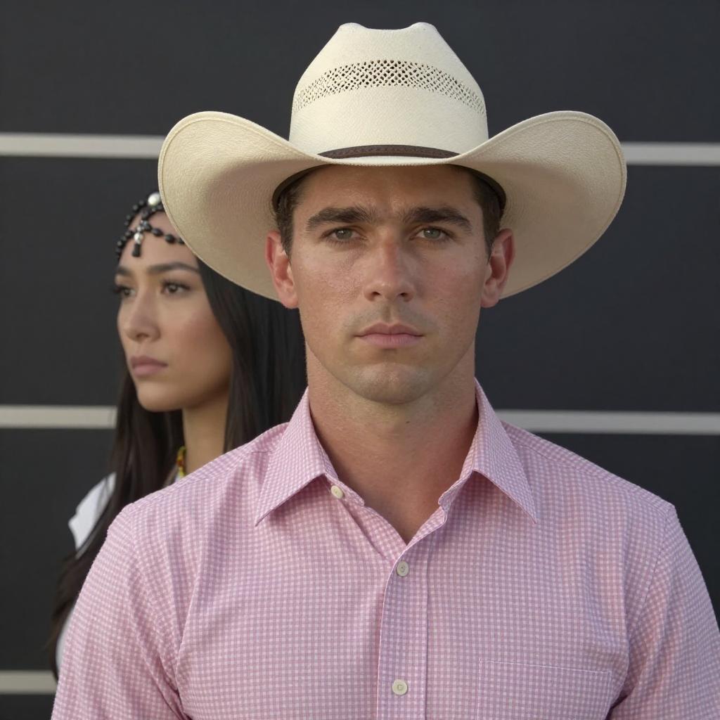 A close-up scene with a man and woman facing each other. The man, wearing a beige cowboy hat and plaid shirt, has short dark hair and intense gaze. The woman, with dark hair in an updo, has light skin and is looking up at him. Background is blurred with indistinct people. The man's left hand is on the woman's shoulder.