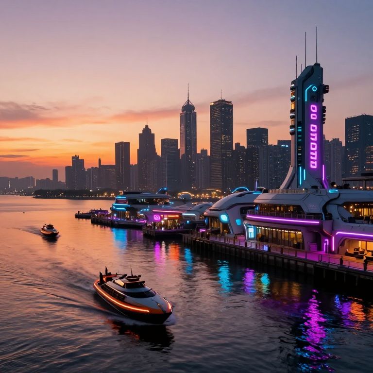 Photograph of a vibrant cityscape at sunset. The skyline features tall, modern skyscrapers silhouetted against a colorful sky of orange and pink. A neon-lit "GONDOLAS" sign is prominently displayed on a futuristic building on the right. The calm water reflects the colorful sky and neon lights. Several boats, including a small motorboat in the foreground and larger yachts in the background, are docked along a brightly lit pier. The pier has modern architecture with glowing purple and blue lights. The overall scene is dynamic and visually striking, blending natural and artificial beauty.