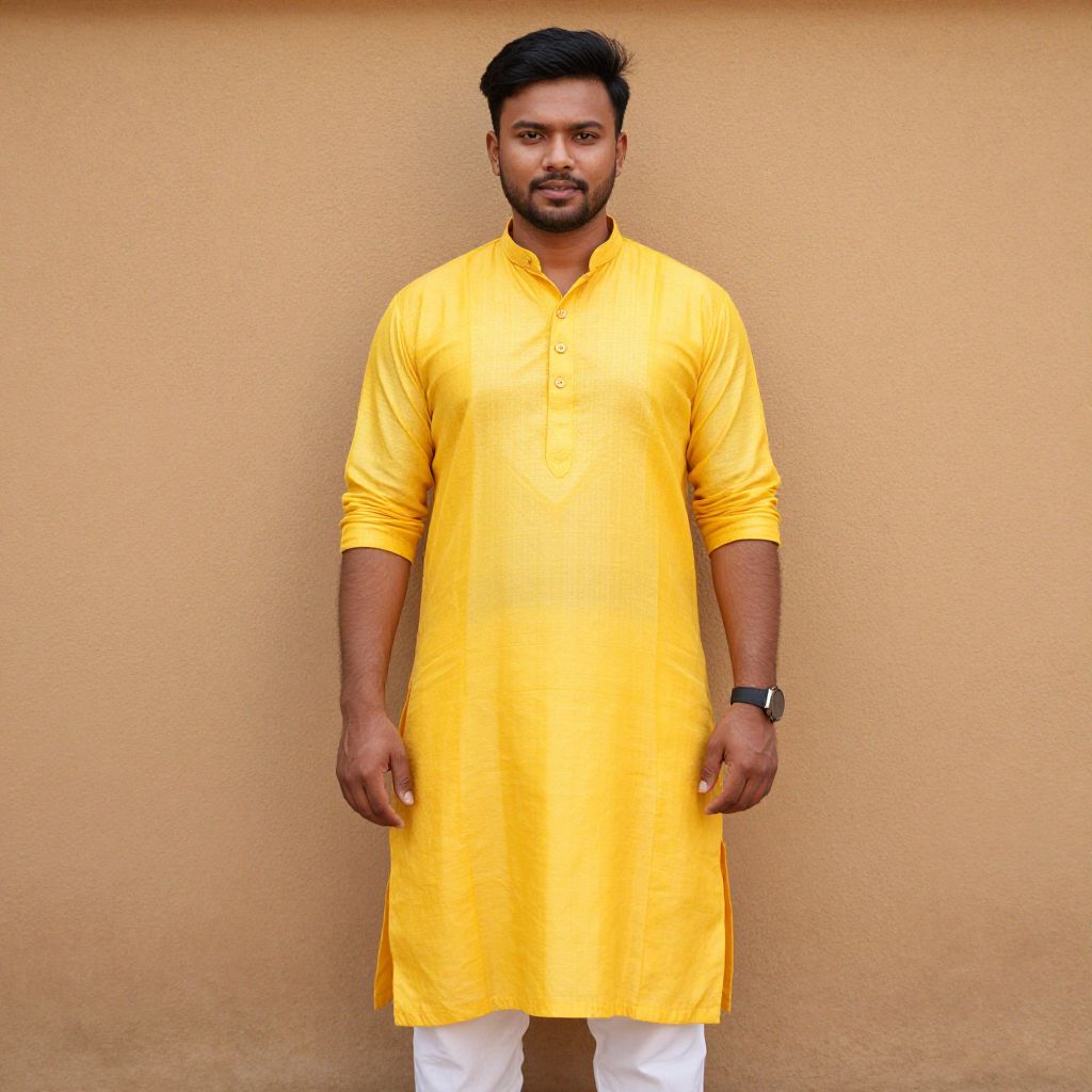 "Traditional Short Kurta, a man in a yellow shirt standing in front of a wall"