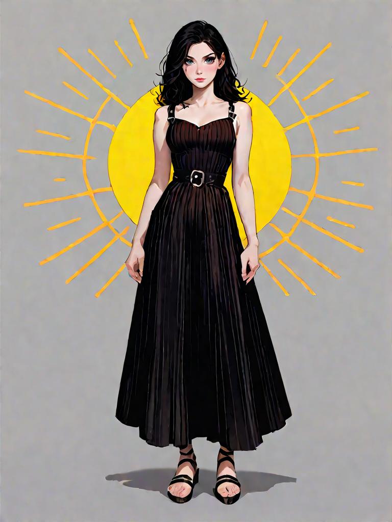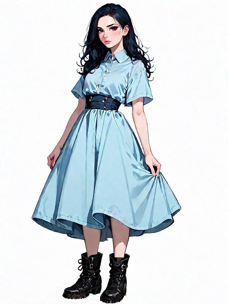 1girl, source_comics, realistic face, full body shot, Woman, bohemian style, red maxi dress with floral print, V-neckline, long sheer sleeves with gathered cuffs, cinched waist with drawstring, full flowing skirt, mid-calf length, paired with black combat boots, simple braided hairstyle, plain white photo studio background.