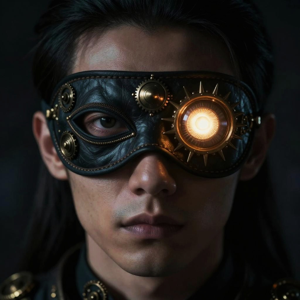 Hero eye mask close-up, mysterious figure with a glowing eye mask, dark moody atmosphere, steampunk aesthetic, intricate design, intense gaze