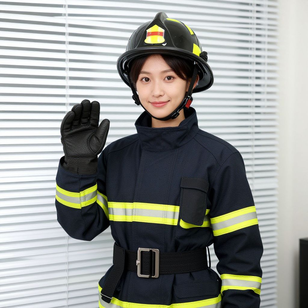 "firefighter woman costume, 1boy, solo, male focus, gloves, helmet, looking at viewer, black gloves, uniform, belt, standing, realistic, window blinds, smile Realistic photo of casual sexy person with pretty face"