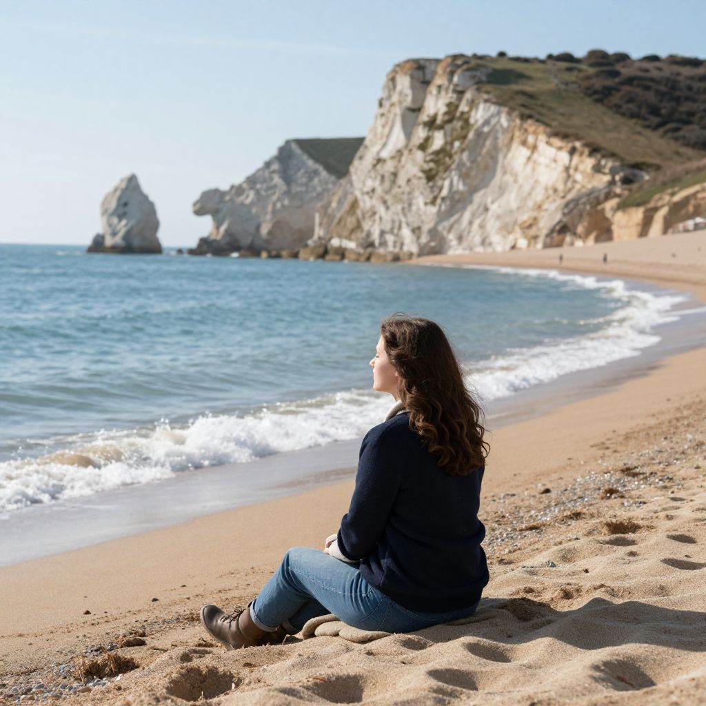 Amidst the timeless embrace of Dorset’s azure waters and rugged cliffs, a woman finds solace on Chesil Beach, her spirit bathed in the warmth of sunlight and the gentle rhythm of waves, embodying a serene communion with nature and the eternal allure of freedom.