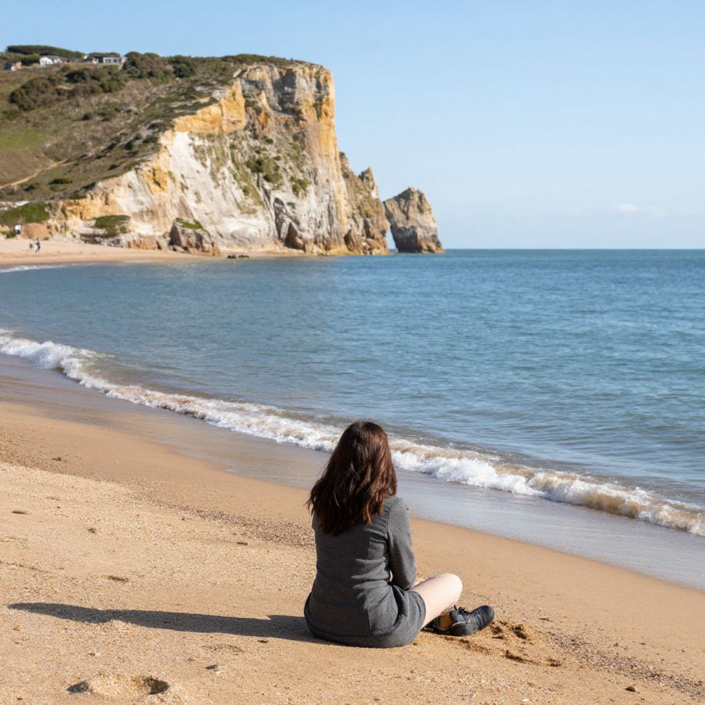 Photograph of a woman with long, wavy brown hair sitting on a sandy beach, facing the ocean. She wears a black long-sleeve top, blue jeans, and black boots. The beach stretches into the distance with white-capped waves gently lapping at the shore. In the background, rugged cliffs with green vegetation rise up against a clear blue sky. The light is bright, casting soft shadows on the sand. The woman is positioned in the lower right, while the ocean and cliffs occupy the upper left and center of the image.